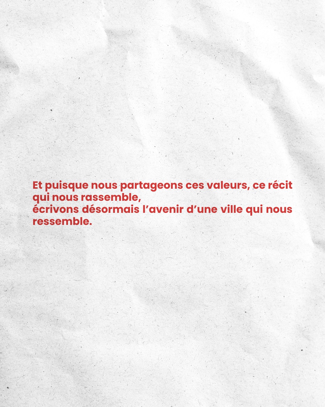 Il est temps de réapprendre à vivre, à vibrer, à aimer cette ville qui le mérite tant. Et puisque nous partageons ces valeurs, ce récit qui nous rassemble, écrivons désormais l'avenir d'une ville qui nous ressemble.