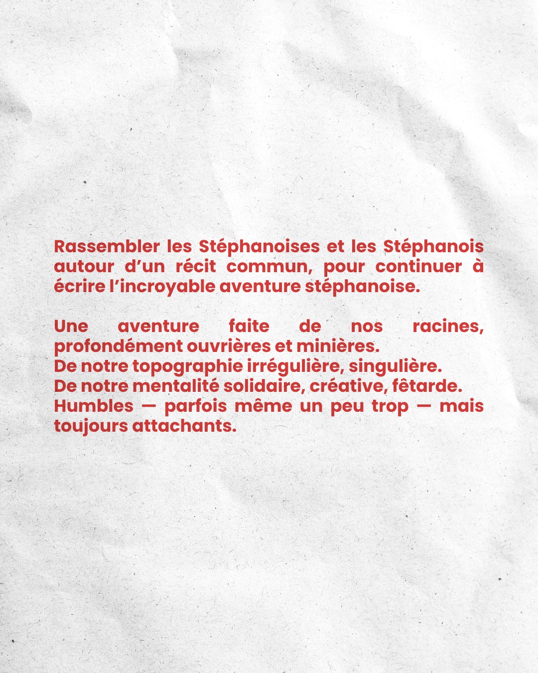 Une aventure faite de nos racines, profondément ouvrières et minières. De notre topographie irrégulière, singulière. De notre mentalité solidaire, créative, fêtarde. Humbles — parfois même un peu trop — mais toujours attachants.