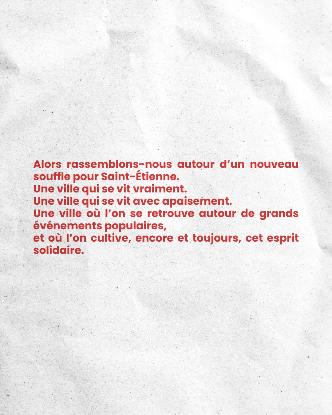 Alors rassemblons-nous autour d'un nouveau souffle pour Saint-Étienne. Une ville qui se vit vraiment. Une ville qui se vit avec apaisement. Une ville où l'on se retrouve autour de grands événements populaires, et où l'on cultive, encore et toujours, cet esprit solidaire.
